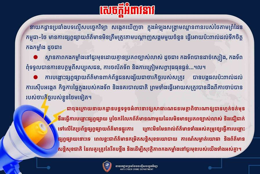 (ភ្នំពេញ)៖ នៅព្រឹកថ្ងៃទី ២៨ ខែ កក្កដា ឆ្នាំ ២០២៥នេះ នាយកដ្ឋានប្រឆាំងបទ ល្មើសបច្ចេកវិទ្យា សង្កេតឃើញថា ក្នុងអំឡុងសង្គ្រាមឈ្លាន ពានរបស់ថៃតាមព្រំដែនកម្ពុជា-ថៃ មានការផ្សព្វផ្សាយព័ត៌មាន មិនត្រឹមត្រូវតាមបណ្តាញសង្គមមួយចំនួន ធ្វើអោយប៉ះពាល់ ដល់ទឹកចិត្តកងកម្លាំង ដូចជា៖