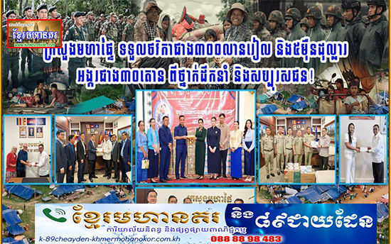 សូមបញ្ជាក់ថា គិតចាប់ពីថ្ងៃទី៣០ ខែកក្កដា រហូតដល់ថ្ងៃទី១ ខែសីហា ឆ្នាំ២០២៥ ក្រសួងមហាផ្ទៃទទួលបានការគាំទ្រពីថ្នាក់ដឹកនាំ និងសប្បុរសជននានា ដែលបានចូលរួម ឧបត្ថម្ភដល់ជនភៀសសឹក និងកម្លាំងជួរមុខសរុប ជាថវិកាចំនួន ១៨៦,២៤៩,០០០រៀល និងប្រាក់ដុល្លារ ២៨,៦៣៧ដុល្លារ ព្រមទាំងអង្ក២១តោន។ ដូចច្នេះ គិតត្រឹមថ្ងៃនេះក្រសួងមហាផៃ្ទទទួលបាន សរុបថវិកាចំនួន ៣៣៧,២៤៩,០០០រៀល និង៥០,៨៩២ដុល្លារ រួមទាំងអង្ករ៣៦,១០០គីឡូក្រាម៕