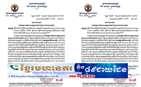 (ខេត្តបន្ទាយមានជ័យ)៖ នៅថ្ងៃទី២៥ ខែសីហា ឆ្នាំ២០២៥នេះ អភិបាលខេត្ត បន្ទាយមានជ័យ ជូនដំណឹងដល់ភាគីថៃ៖ ការសន្យាចេញ ប័ណ្ណកម្មសិទ្ធិឲ្យ ពលរដ្ឋថៃ នៅភូមិ Nong Chan ស្រុក Khok Sung ខេត្តស្រះកែវ ដែលជាប់នឹង ភូមិជោគជ័យ ឃុំអូរបីជាន់ ស្រុកអូរជ្រៅ ខេត្តបន្ទាយមានជ័យ គឺជាសិទ្ធិរបស់អាជ្ញាធរថៃ ប៉ុន្តែមិនត្រូវធ្វើឲ្យប៉ះពាល់ ដល់អធិបតេយ្យ របស់កម្ពុជា ឬប៉ះពាល់ដល់ តំបន់ដែលគណៈ កម្មការចម្រុះខណ្ឌសីមា ព្រំដែនគោក (JBC) នៃប្រទេសទាំងពីរ ពុំទាន់បានឯកភាព ខណ្ឌសីមានៅលើដីជាក់ស្ដែង ឬប៉ះពាល់ដល់តំបន់ ដែលប្រជាពលរដ្ឋកម្ពុជា កំពុងកាន់កាប់ និងអាស្រ័យផលឡើយ។