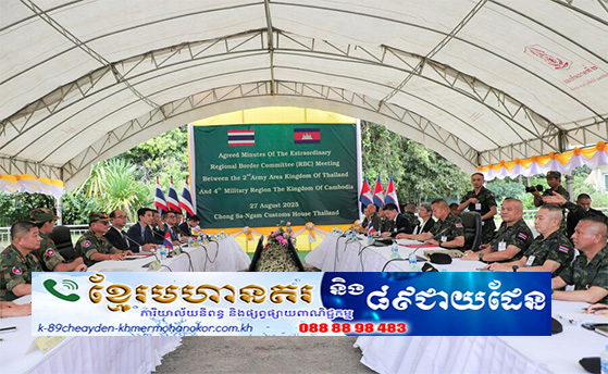 (ភ្នំពេញ)៖ អ្នកនាំពាក្យ ក្រសួងការពារជាតិ នៃព្រះរាជាណាចក្រកម្ពុជា នៅថ្ងៃទី២៧ ខែសីហា ឆ្នាំ២០២៥ បានឲ្យដឹងថា កិច្ចប្រជុំវិសាមញ្ញ របស់គណៈកម្មាធិការ ព្រំដែនថ្នាក់យោធភូមិភាគ កម្ពុជា-ថៃ (RBC) ប្រព្រឹត្តនៅព្រឹកថ្ងៃនេះ នៅច្រកព្រំដែន អន្តរជាតិជាំ-សាង៉ាំ ខេត្តឧត្តរមានជ័យ។