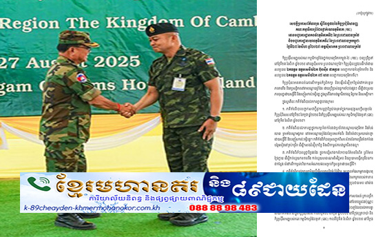 (ភ្នំពេញ)៖ ឯកឧត្តម ឧត្តមសេនីយ៍ឯក ប៊ុនស៊ីន ផាតខ្លាង មេបញ្ជាការដា្ឋន កងទ័ពភូមិភាគទី២ នៃព្រះរាជាណាចក្រថៃ និងមេបញ្ជាការដ្ឋាន យោធភូមិភាគទី៤ នៃព្រះរាជាណាចក្រកម្ពុជា ឯកឧត្តម ឧត្តមសេនីយ៍ឯក ពៅ ហេង បានឯកភាពគ្នា មិនពង្រីកវិសាលភាព និងទំហំនៃវិវាទ រួមបញ្ចូលទាំងសកម្មភាព បង្កហេតុរបស់ទាហាន ឬប្រជាជន ដែលអាចនាំឱ្យ មានភាពតានតឹង ដូចជាសម្តីអុជអាល និងសកម្មភាព របស់ទាហាន ដែលទន្ទ្រាន ចូលទីតាំងរបស់ភាគីម្ខាងទៀត នៅក្រោយពេល ដែលបទឈប់បាញ់ ចូលជាធរមាន នៅម៉ោង ២៤:០០នាទី (ម៉ោងក្នុងស្រុក) ថ្ងៃទី២៨ ខែកក្កដា ឆ្នាំ២០២៥។