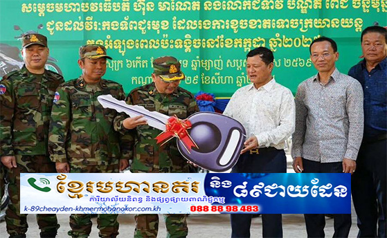 (ភ្នំពេញ)៖ សម្តេចមហាបវរធិបតី ហ៊ុន ម៉ាណែត នាយករដ្ឋមន្ត្រីកម្ពុជា និងលោកជំទាវបណ្ឌិត ពេជ ចន្ទមុន្នី ហ៊ុនម៉ាណែត តាមរយៈ លោកអ្នកឧកញ៉ា ទ្រី ភាព បេសកជនពិសេស របស់សម្តេចតេជោ ហ៊ុន សែន ប្រធានព្រឹទ្ធសភាកម្ពុជា និងលោកជំទាវឧកញ៉ា គៀន ស្រីនាង បានឧបត្ថម្ភម៉ូតូចំនួន ១ពាន់គ្រឿងជូនដល់ កងទ័ពជួរមុខ ក៏ដូចជាអង្គភាពទ័ព ប្រើប្រាស់តាមតម្រូវការ ចាំបាច់លើកិច្ចការពារជាតិ។