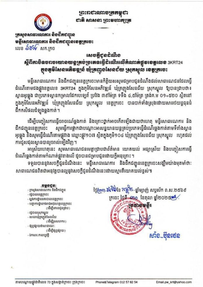 អាជ្ញាធរខេត្តក្រចេះ បានអំពាវនាវដល់ម្ចាស់ និងអ្នកបើកបររថយន្តធុនធំទាំងអស់ ឲ្យគោរពច្បាប់ចរាចរណ៍ និងការផ្ទុកទំនិញតាមទំងន់អនុញ្ញាត ដើម្បីការពារសុវត្ថិភាពសាធារណៈ និងសម្ភារៈរបស់រដ្ឋ៕SAMNEANG